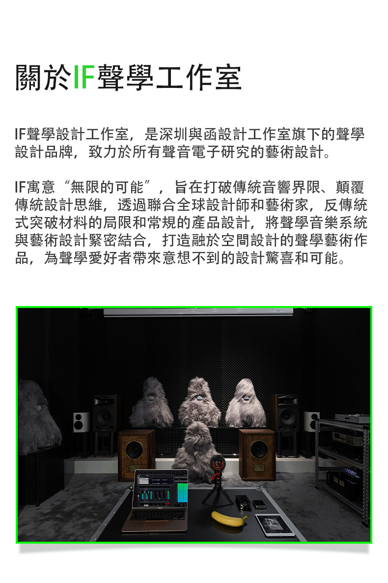 IF寓意“無限的可能”,旨在打破傳統音響界限、顛覆傳統設計思維,透過聯合全球設計師和藝術家,反傳統式突破材料的局限和常規的產品設計,將聲學音樂系統與藝術設計緊密結合,打造融於空間設計的聲學藝術作品,為聲學愛好者帶來意想不到的設計驚喜和可能。